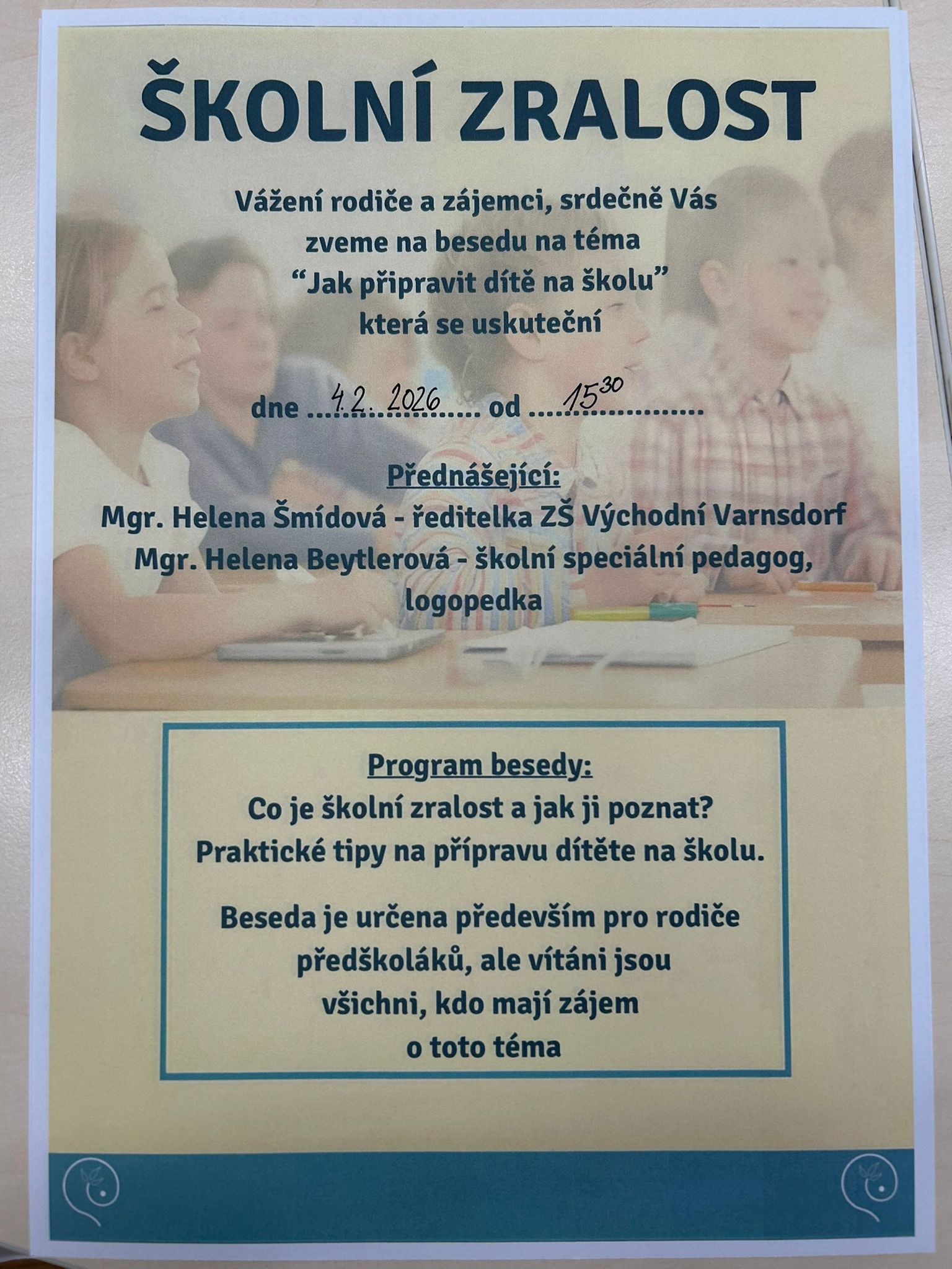 BESEDA PRO RODIČE PŘEDŠKOLÁKŮ ve středu 4.2. 2026 od 15,30 h.