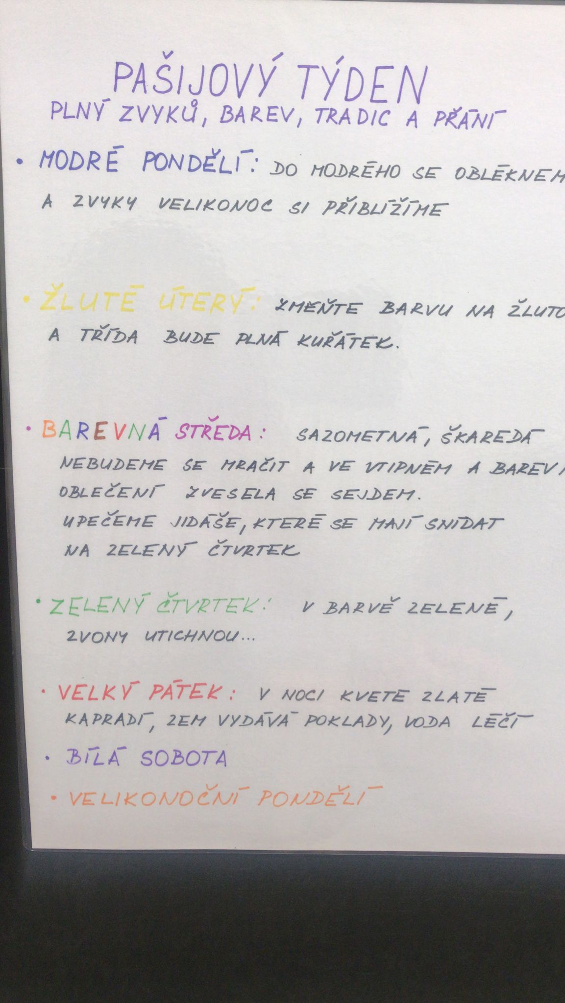 prosíme, oblečte v tomto týdnu (3.4.2023 - 7.4.2023) děti dle barev pašijového týdne. Děkujeme